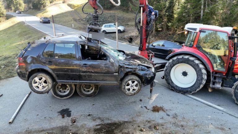 In Krumbach verlor am Dienstag ein 18-Jähriger die Kontrolle über sein Auto. Der Wagen geriet von der L205 auf eine Wiese, überschlug sich mehrfach und landete auf dem Dach. Ersthelfer versorgten den Fahrer, bevor er ins Landeskrankenhaus Bregenz gebracht wurde. Ein Alkoh