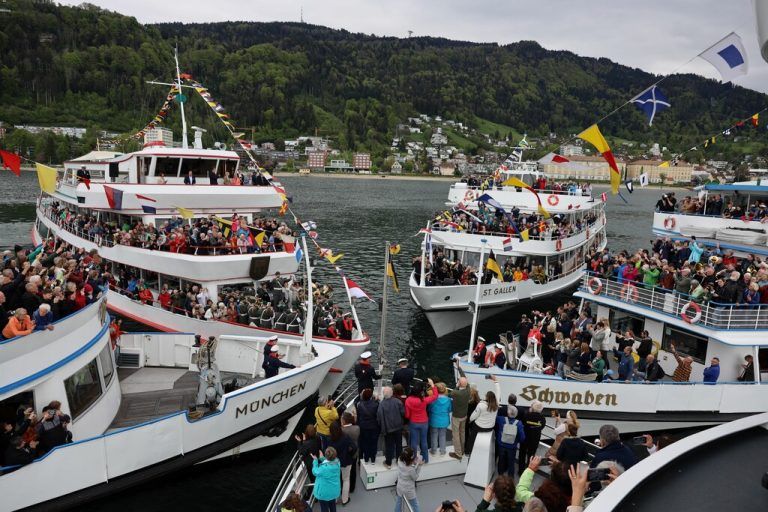 Sechs Schiffe der Weißen Flotte der Vereinigten Schifffahrtsunternehmen für den Bodensee und Rhein bildeten am Wochenende zum Saisonstart einen Stern vor der Stadt Bregenz. Diese Flottensternfahrt fand zum 52. Mal statt.⇒VSU