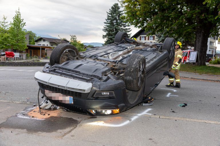 Nach einer rechtwinkligen Kollision im Kreuzungsbereich Montfortstraße/Hummelbergstraße wurde gestern ein Fahrzeug eines 21-Jährigen durch die Wucht des Aufpralls in einen Randstein geschleudert, überschlug sich und kam etwa 15 Meter weiter auf dem Dach liegend zum Stillstand. Beide Lenker wurd