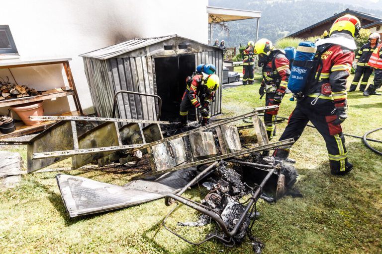 Ein Gartenhaus ist Donnerstagnachmittag in Thüringerberg in Vollbrand geraten. Das Feuer zerstörte dabei zwei darin befindliche E-Bikes sowie einen Rasenmäher. Das Gartenhaus selbst wurde durch den Brand schwer beschädigt, eine angrenzende Fassade eines Wohnhauses musste von der Feuerwehr geküh