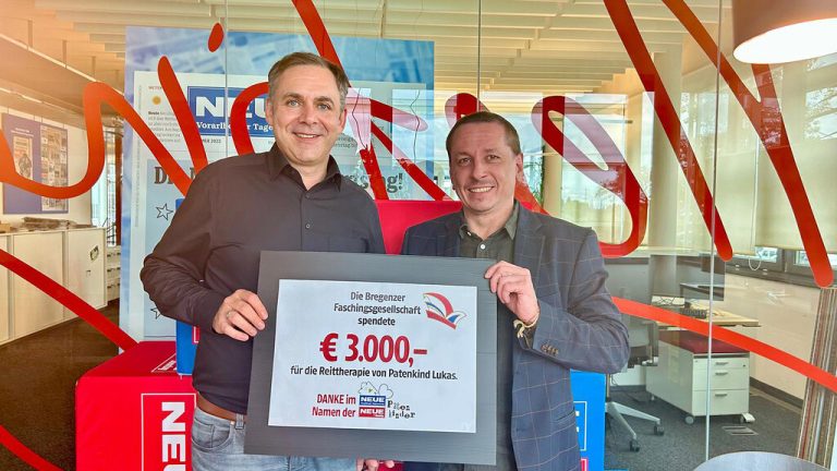 Die Bregenzer Faschingsgesellschaft spendete 3000 Euro für die Reittherapie von NEUE-Patenkind Lukas in Frankreich. Auf dem Bild: Florian Rainer und NEUE-Chefredakteur Joachim Mangard.